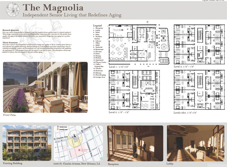 My project explores the relationship between interior design and quality of life by creating spaces that promote physical and mental well-being, alleviate feelings of social isolation, and foster independence. By prioritizing accessibility, comfort, and personalized care, my boutique independent living home will emphasize the importance of a well-designed space and the impact it can have on users. This atmosphere will prompt seniors to embrace this new chapter of life and redefine aging.