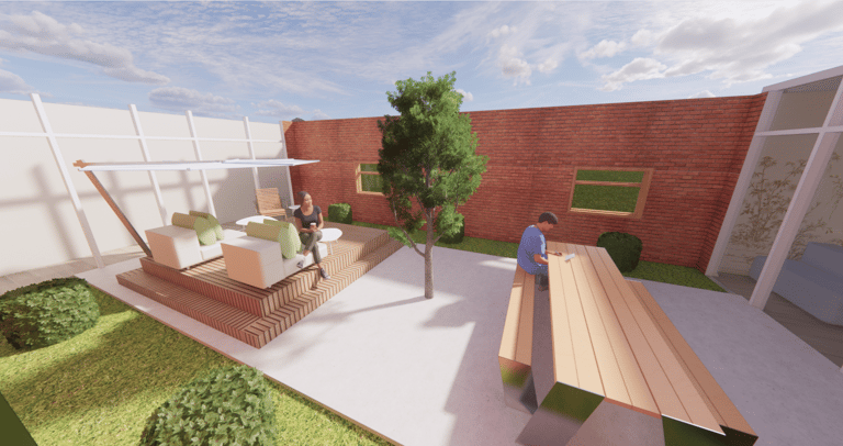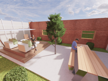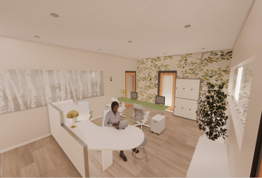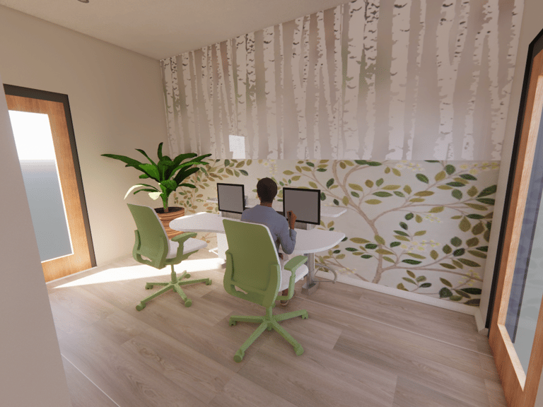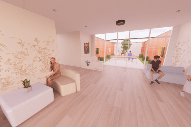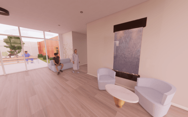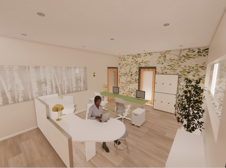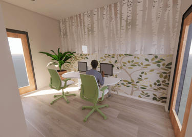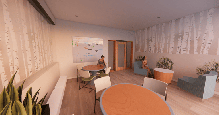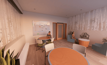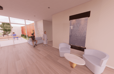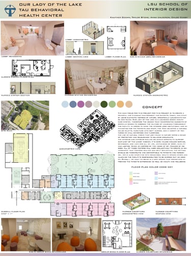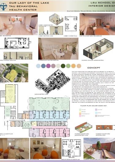 For this project, we were tasked to renovate an existing structure, the Tau Center for Behavioral Health. We met with staff from Our Lady of the Lake to learn what they were looking for in the new design and we split into teams and created multiple design solutions. I was responsible for designing the lobby, the nurse station, a small dining area, and the nurse courtyard. All of the work was done in Revit and I used Enscape to produce the renderings.